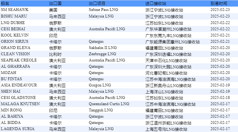 表1:2月17日-2月23日中国LNG进口分析