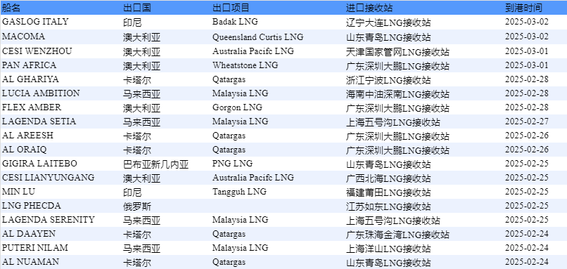 表2:2月24日-3月2日中国LNG进口预测
