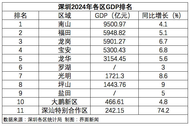 深圳各区2024年经济运行情况揭晓:南山区GDP近万亿,坪山区增速领跑