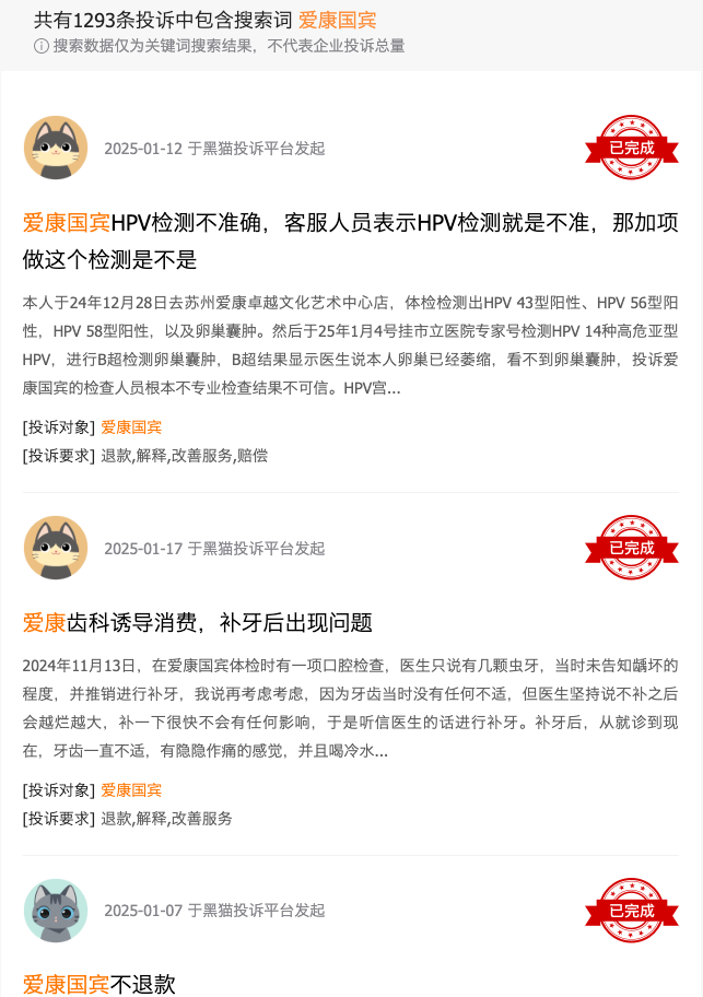 据黑猫投诉平台数据,截至2025年2月,爱康国宾累计投诉量已达1293条,投诉主要集中在误诊漏诊、流程不规范及虚假宣传方面。典型案例包括:漏检导致治疗延误、检测结果矛盾及流程管理缺陷等。