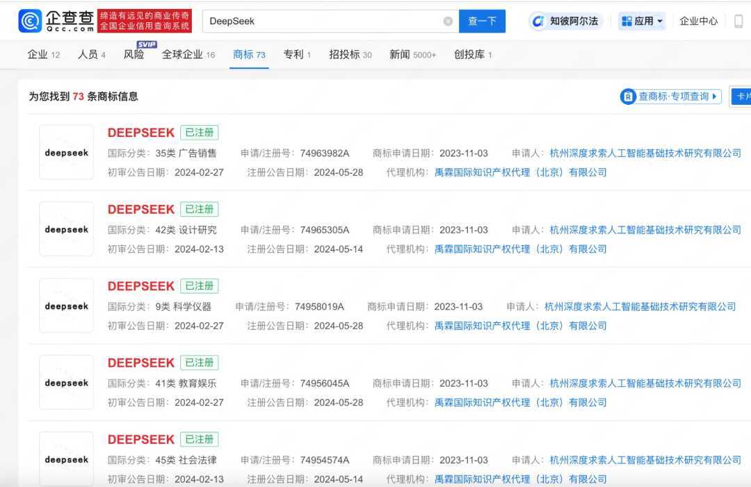 企查查APP数据显示,杭州深度求索人工智能基础技术研究有限公司早在2023年11月3日就申请了“DEEPSEEK”商标,但除该公司外,仍有超过5家企业近期尝试注册该商标。