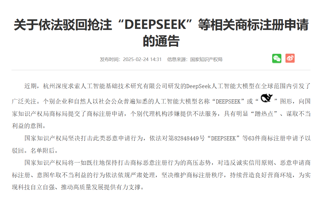 国家知识产权局发布通告,驳回包括“DEEPSEEK”在内的63件恶意商标注册申请,打击企业和个人蹭热点、谋取不当利益的行为。杭州深度求索公司最早于2023年申请该商标。