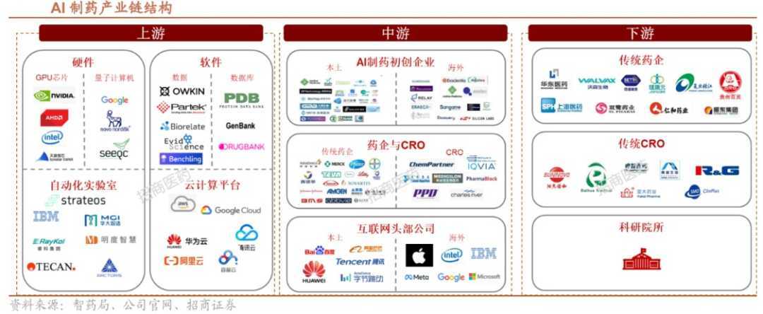 上游为软硬件供应商,中游为AI制药主体,下游为需求方。