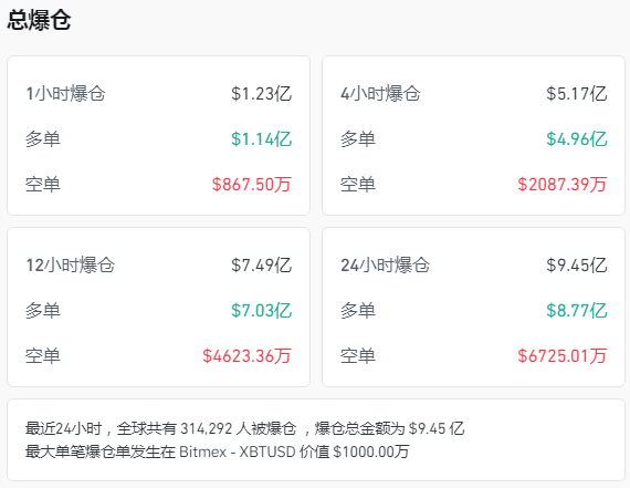 根据CoinGlass的数据统计,最近24小时内,全市场共有超过31万名投资者因爆仓而损失惨重,总爆仓金额高达9.45亿美元。
