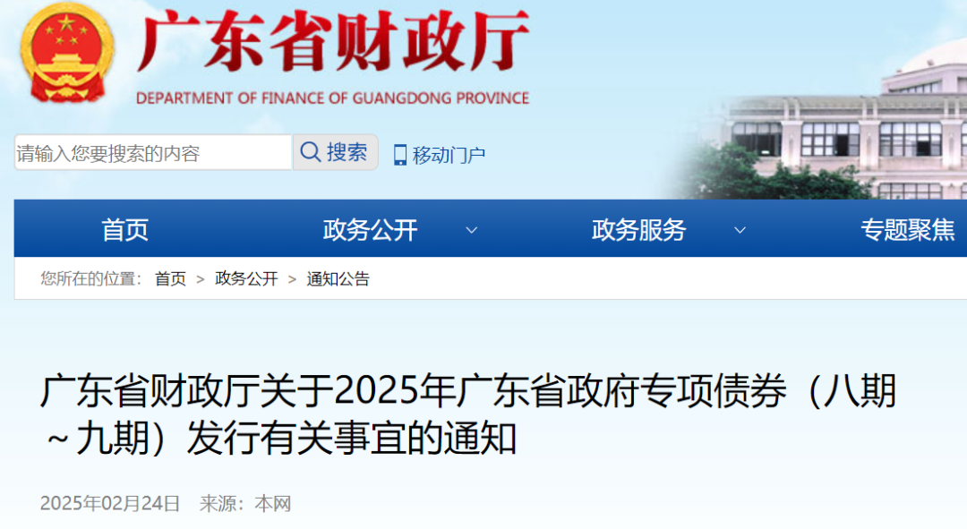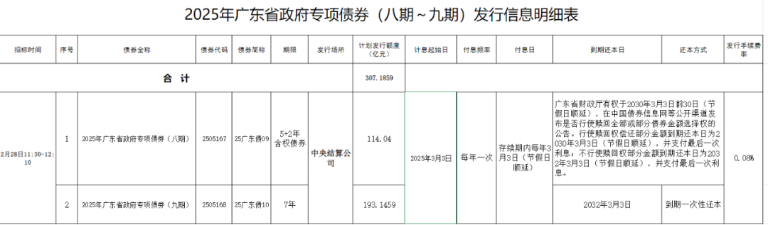 2月24日,广东省财政厅发布了《关于2025年广东省政府专项债券(八期~九期)发行有关事宜的通知》,进一步明确了债券的发行计划和用途。本批债券共2期,合计发行额度为307.1859亿元,其中八期期限为5+2年含权债券,九期期限为7年。