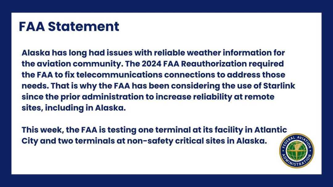 周一(2月24日),FAA发布声明,证实在美国空域系统中正测试星链终端,旨在提高偏远站点如阿拉斯加的可靠性。本周,FAA将在大西洋城设施中测试一台终端,并在阿拉斯加的非安全关键地点测试两台终端。