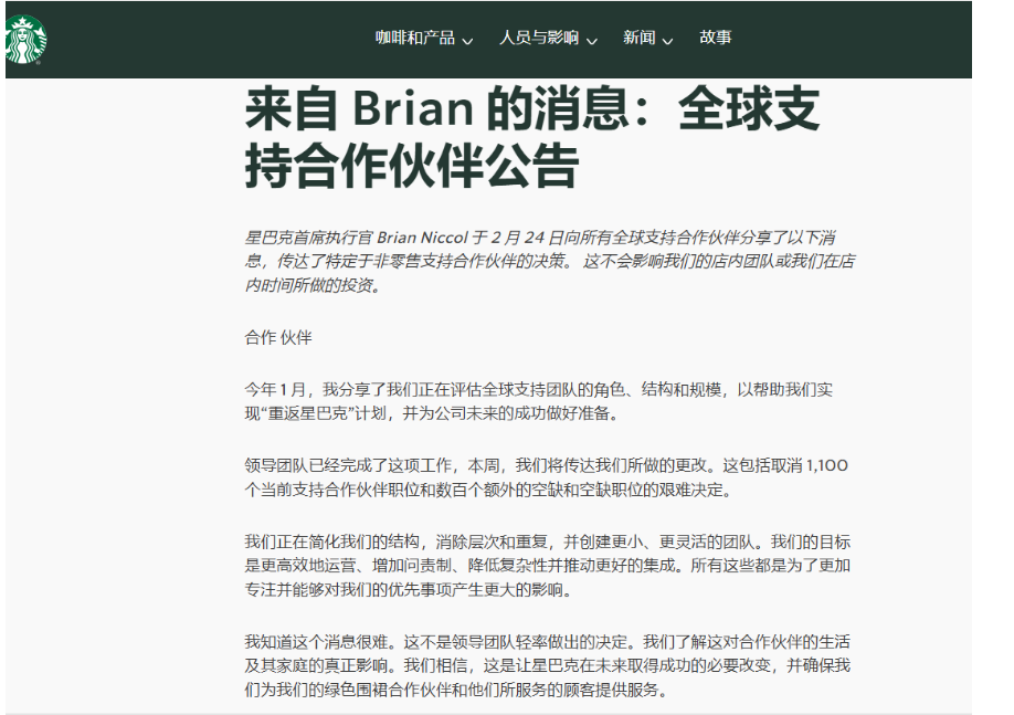 “我们深知这一决定对员工及其家庭的影响。然而,我们相信这是让星巴克在未来取得成功的必要改变,并确保我们为门店一线员工和他们所服务的顾客提供更好的服务。”Brian Niccol说,“我们还将尽一切努力支持那些离职的员工,包括提供全面的遣散费。”