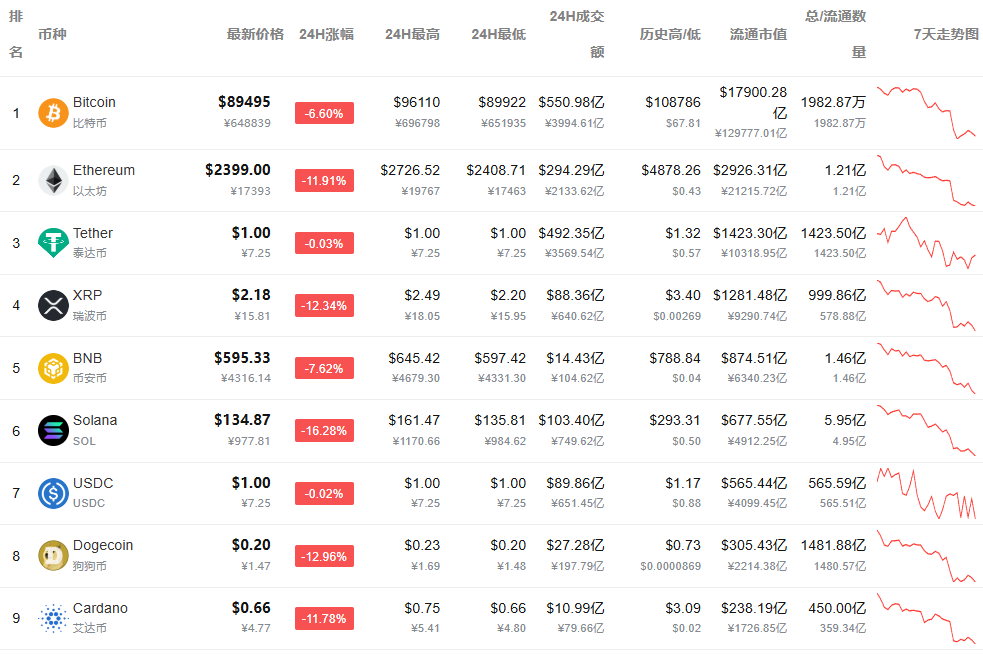 2月25日,比特币价格出现大幅下跌,一度跌破89000美元大关,日内跌幅超过6%。同时,以太坊日内跌幅也达到了12%,瑞波币、币安币、狗狗币等其他加密货币同样快速下探,市场整体表现不佳。