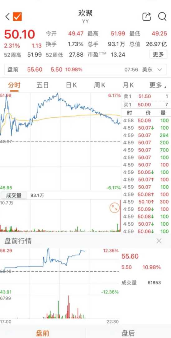 受百度与YY直播收购事项最终落定的利好消息影响,欢聚集团美股盘前股价迅速攀升,截至发稿时,涨幅已接近11%。