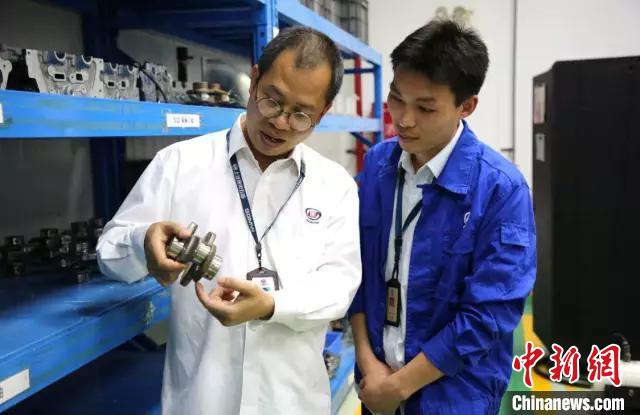 图为杨晓(左)在指导年轻科研人员。广西汽车集团提供