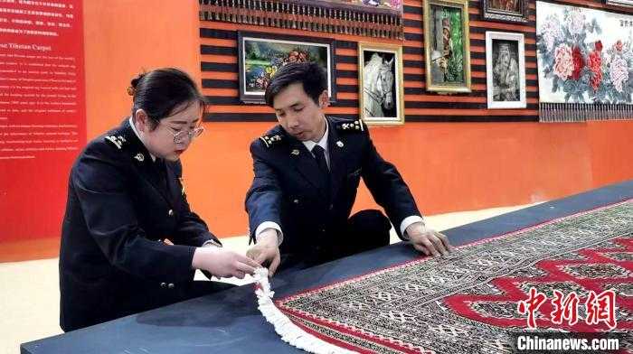 图为西海海关关员正在对即将出口的藏毯进行细致查验。西海海关供图