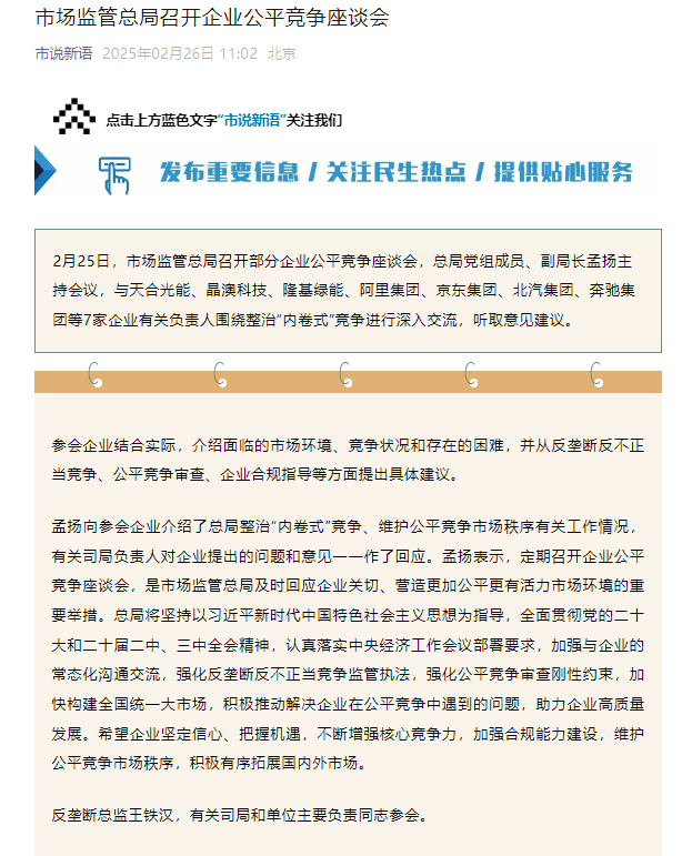 2月25日,国家市场监督管理总局召开部分企业公平竞争座谈会,与天合光能、阿里集团等7家企业负责人深入交流整治“内卷式”竞争。会议旨在加强企业间的公平竞争,促进市场健康发展,助力企业高质量发展。