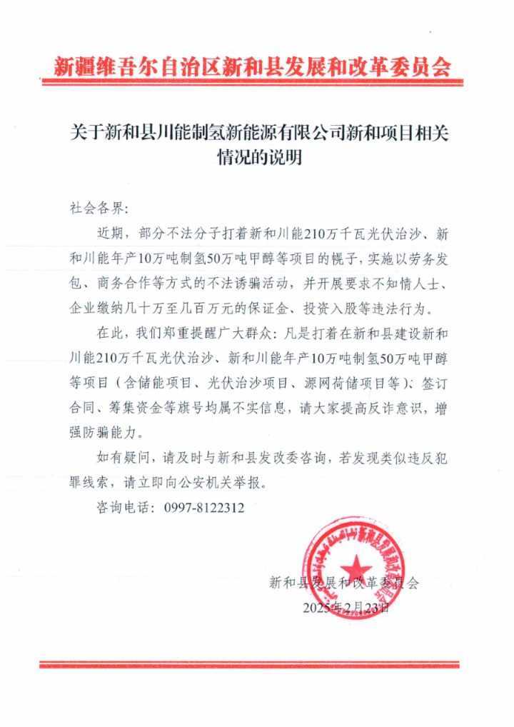 近日,部分网民发布新疆新和县川能210万千瓦光伏治沙一体化项目等信息,引发关注。新疆网络辟谣公众号证实,以“新和县川能光伏治沙”等项目名义签订合同、募集资金或发布融资信息的,均属不实信息。