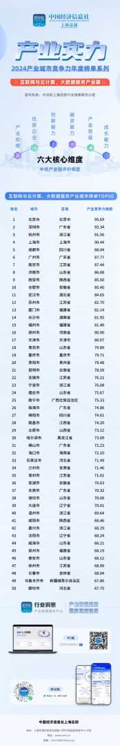 中国经济信息社上海总部发布2024年互联网与云计算、大数据服务产业城市竞争力TOP50排行榜,北京、深圳、杭州位列前三。榜单从六大维度进行综合评估,展现各城市产业优势和发展潜力。