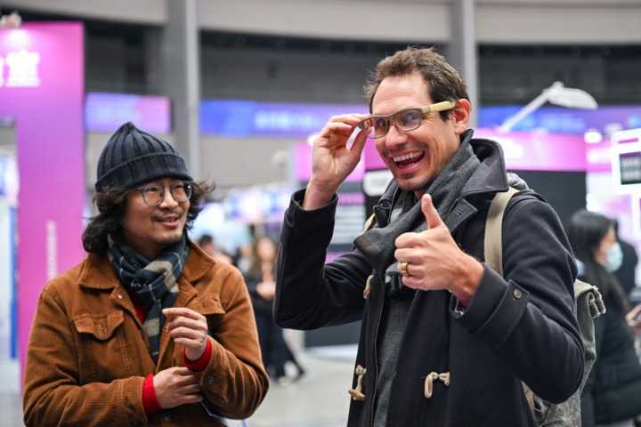 观众在全球开发者先锋大会体验智能眼镜。图源:GJ