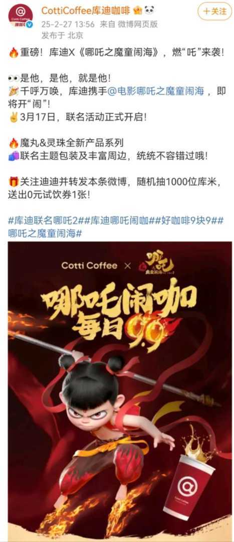 2月27日,库迪咖啡在官方微博宣布,正式联名热门动画电影《哪吒之魔童闹海》(以下简称《哪吒2》),将于3月10日开启周边预售,并在3月17日上线联名活动。此次联名活动,库迪咖啡成为首个与《哪吒2》合作的现制咖啡饮品品牌,双方达成了“现制咖啡饮品”独家合作协议。