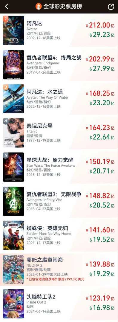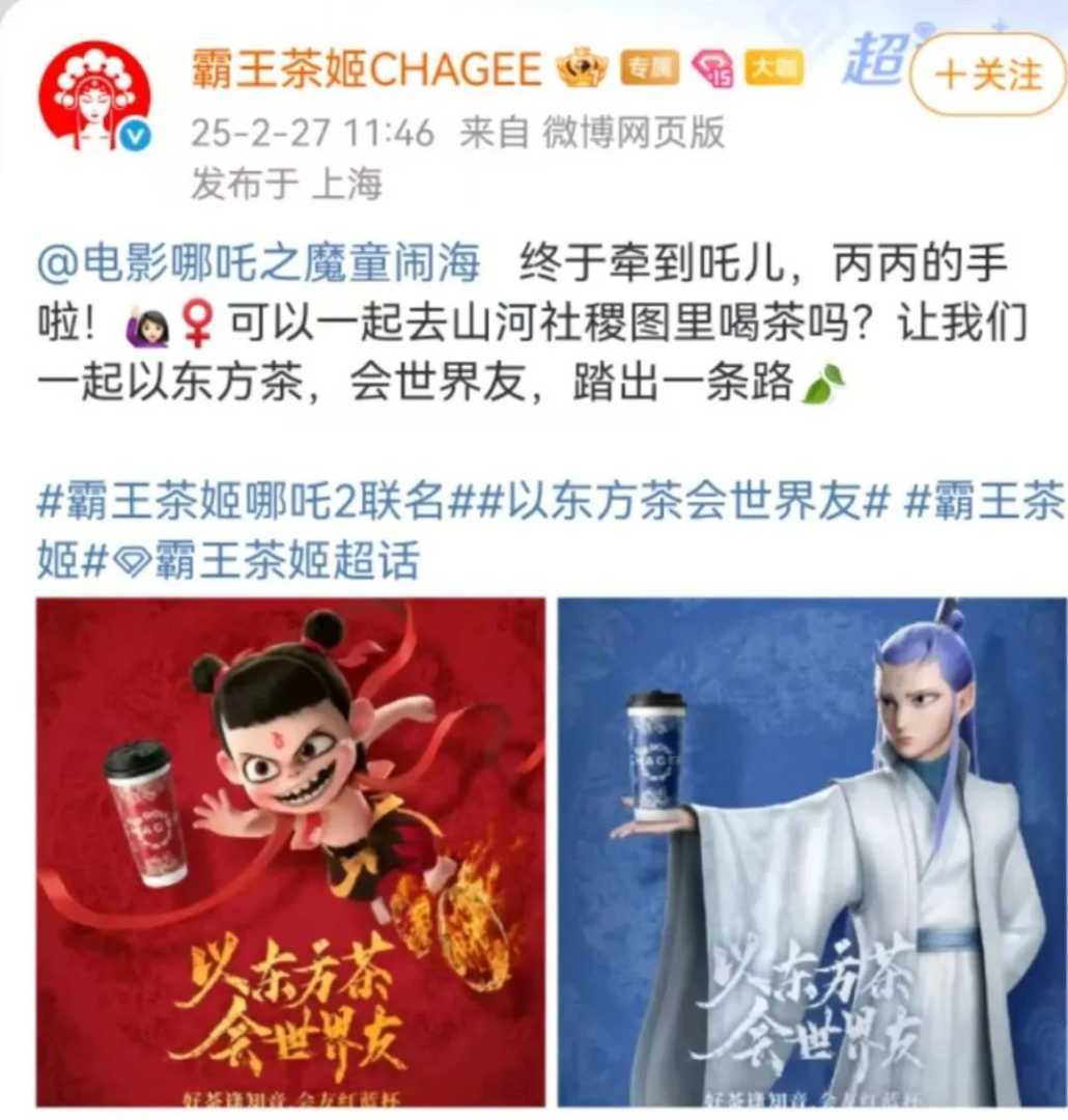 值得注意的是,今天早些时候,另一茶饮品牌霸王茶姬也在其官方微博发文,宣布与《哪吒2》达成合作。截至2月27日下午15时,《哪吒2》票房(含预售)已突破139亿元,位列全球电影票房榜第8名,距离第7名的《蜘蛛侠:英雄无归》仅剩不到2亿元,展现出强大的票房号召力。