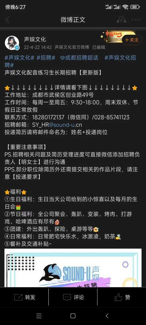 2022年声娱文化官方招聘配音练习生,福利中没有了五险一金。微博截图
