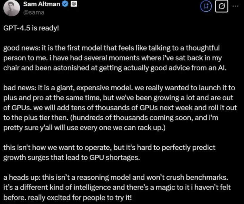 整场发布会直播简短,OpenAI CEO山姆·奥特曼(Sam Altman)未现身,但他在社交平台X上发文表示,GPT-4.5首个给人与有思想的人交谈感觉的模型,他多次惊讶于人工智能给出的优秀建议。然而,GPT-4.5庞大且昂贵,因GPU资源耗尽,将先向Plus用户推出,未来再扩展至更多层级。