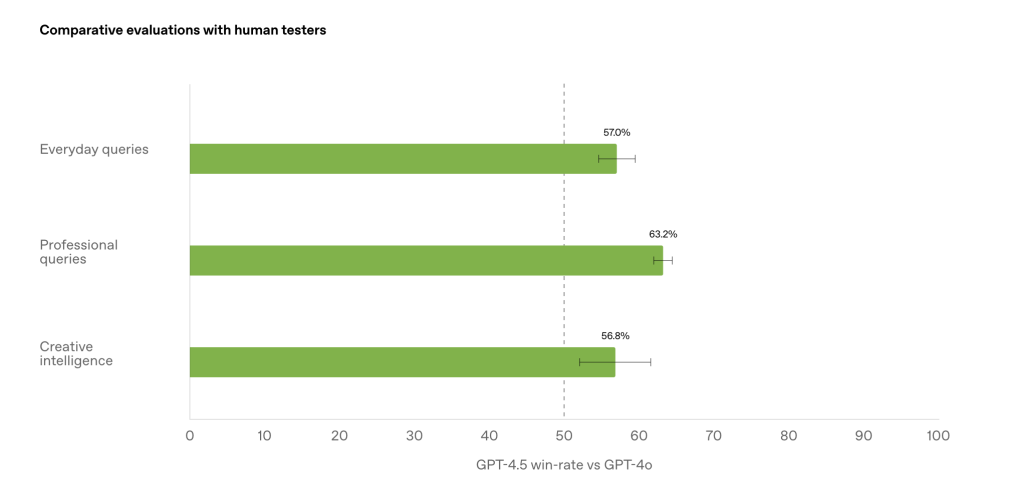 GPT-4.5可操控性、对细微差别理解能力及自然对话能力均提升,能在“温暖且自然”对话中整合想法,深刻理解人类意图,细腻解读微妙暗示或隐含期望。GPT-4.5还展现更强审美直觉和创造力,在写作和设计辅助方面表现出色。在人类偏好测试中,更多人选择GPT-4.5而非GPT-4o。
