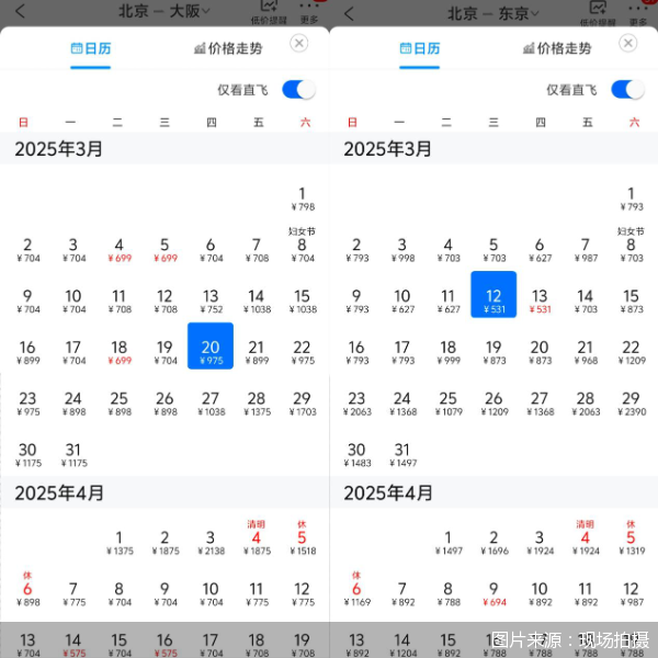 航司增投中日航线运力,赏花季与清明节叠加,激发居民赴日赏樱热情,多地机票涨价。携程显示,北京—大阪航线机票价格从3月20日起上涨,4月3日涨至2138元。北京—东京航线也出现涨价,3月22日起最低价涨至千元以上。