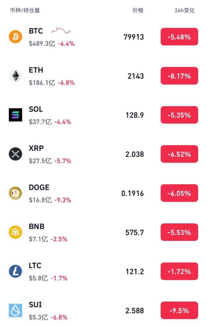 以太坊、SUI币跌幅超过8%,狗狗币、币安币、瑞波币、SOL币跌幅均超过5%。