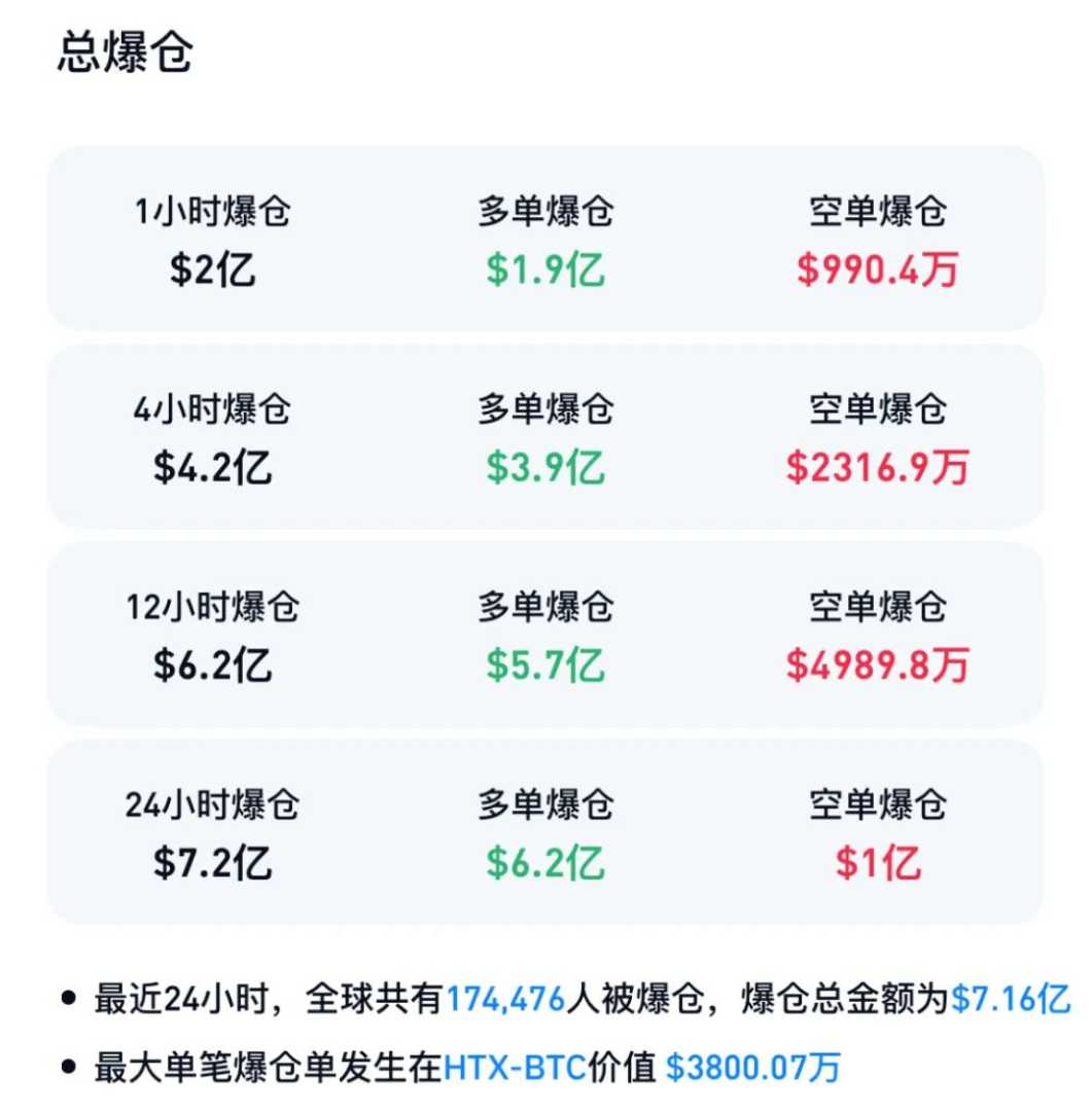 CoinGlass数据显示,最近24小时内,加密货币市场爆仓人数激增,达到17.4万人,爆仓总金额高达7.2亿美元。其中,多单爆仓金额达到6.2亿美元,空单爆仓金额为1亿美元。