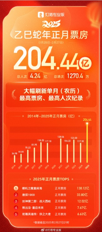 2025年正月电影票房达204.44亿元,刷新中国影史农历单月最高票房、最高人次纪录。影片《哪吒之魔童闹海》农历单月票房突破138.12亿元,成为中国影史农历单月票房冠军。