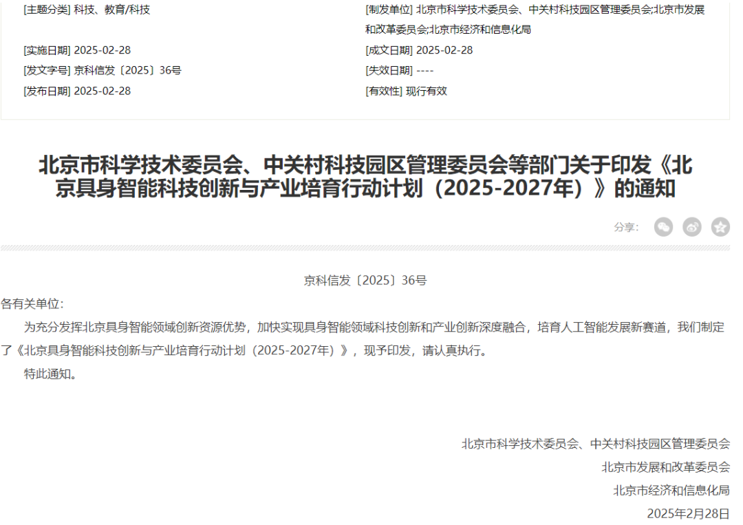 2月28日,北京市科学技术委员会、中关村科技园区管理委员会等部门发布了《北京具身智能科技创新与产业培育行动计划(2025—2027年)》(以下简称《行动计划》),旨在推动具身智能技术的创新与产业发展。