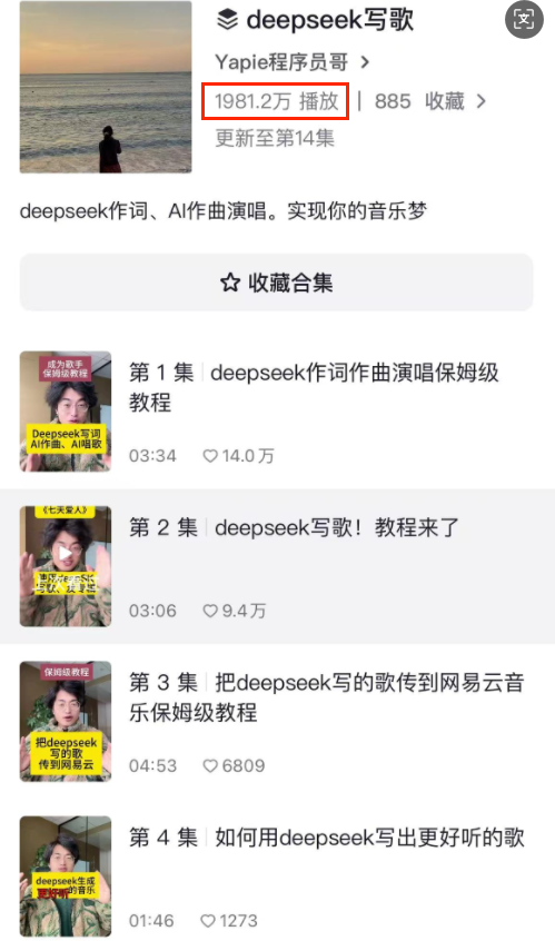 杨先生分享的AI创作音乐教程播放量超1900万。