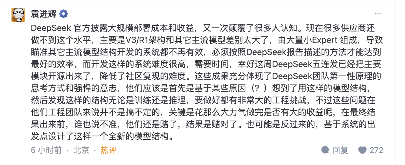 DeepSeek在多个平台发布成本消息,硅基流动创始人袁进辉称,DeepSeek披露的成本和收益颠覆了很多人认知。很多供应商无法达到DeepSeek水平,因其V3/R1架构与主流模型差异大。