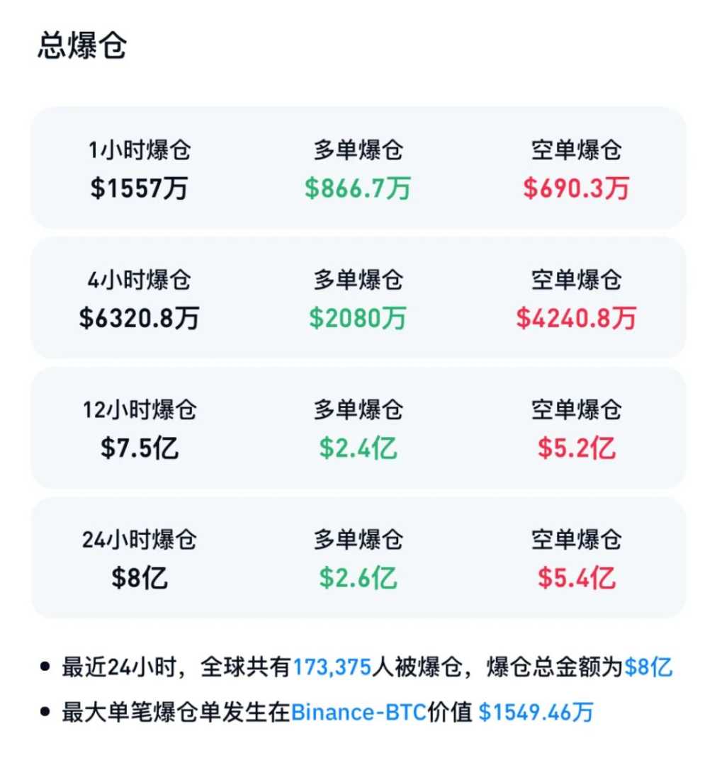 然而,加密货币的剧烈波动也导致大量投资者爆仓。据Coinglass数据显示,过去24小时内,加密货币全网合约爆仓人数超过17万人,爆仓金额超过8亿美元。
