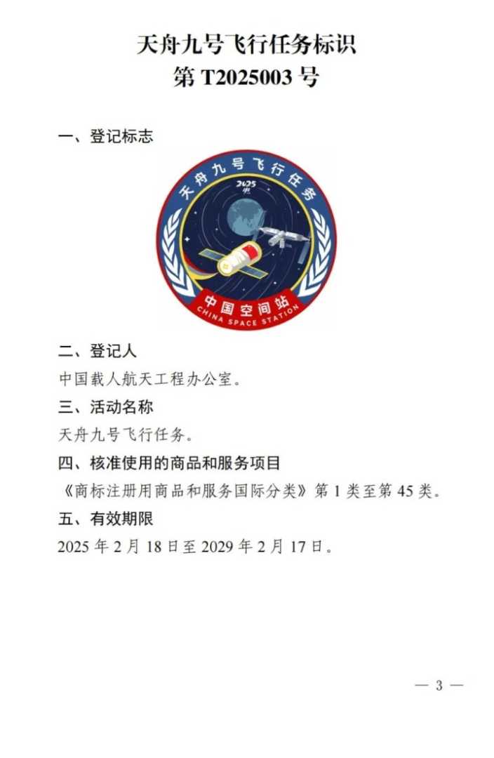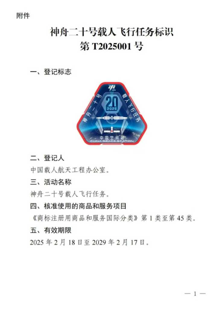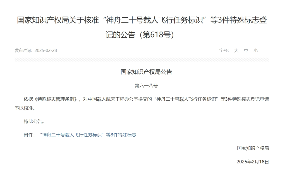 近日,国家知识产权局正式核准了中国载人航天工程办公室提交的“神舟二十号载人飞行任务标识”等3件特殊标志登记申请,这一消息标志着中国航天事业的新进展。以下是公告全文: