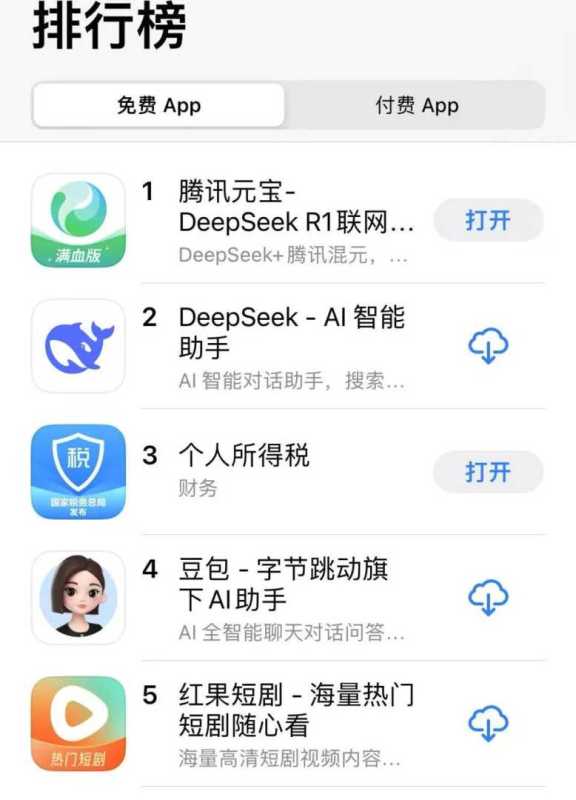 腾讯元宝APP在中国区苹果应用商店免费APP下载排行榜上荣登榜首,将DeepSeek甩在身后。