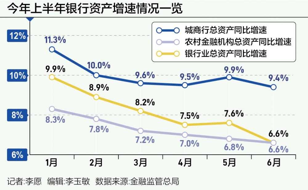 在当前减量提质、整治资金空转、摒弃规模情结的宏观背景下,中小银行的生存发展情况备受关注。金融监管总局发布的数据显示,截至6月末,银行业金融机构总资产同比增速降至今年以来最低的6.6%,其中城商行和农商行的增速也呈现逐月下滑趋势。
