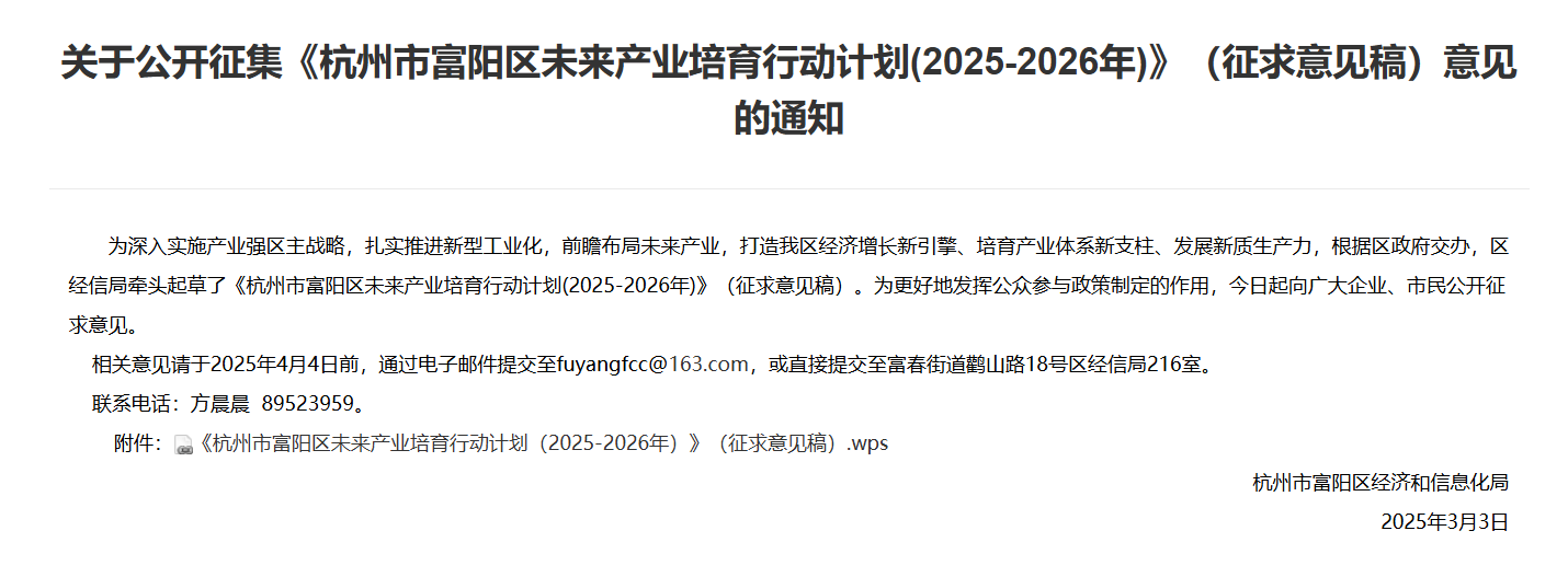 杭州市富阳区人民政府网站消息,日前,杭州市富阳区经济和信息化局发布了《杭州市富阳区未来产业培育行动计划(2025—2026年)》(征求意见稿),旨在推动区域经济的持续发展和创新。