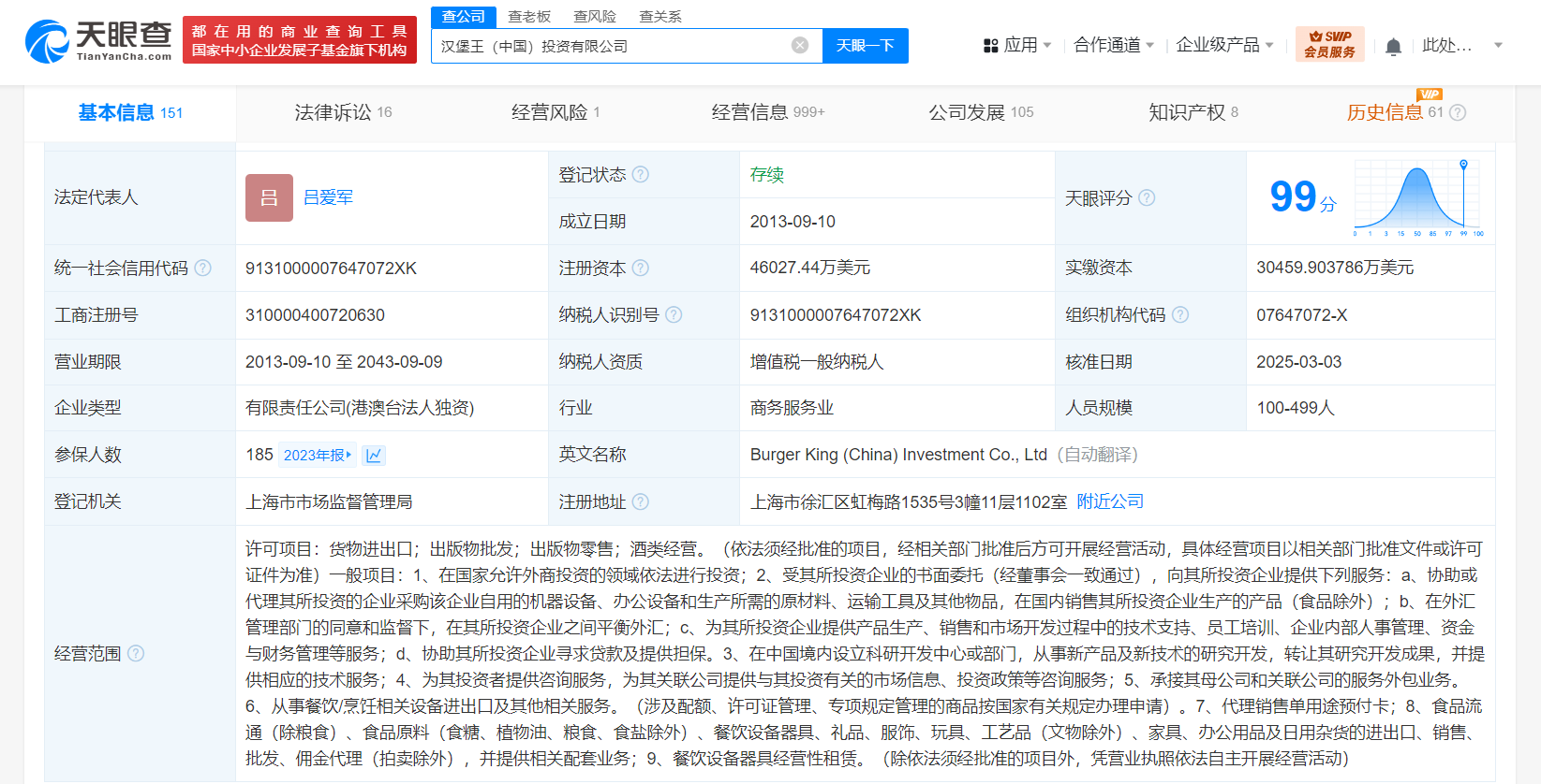 汉堡王(中国)投资有限公司成立于2013年9月,经营范围涵盖货物进出口、出版物批发零售、酒类经营以及在国家允许外商投资的领域进行依法投资等。股东信息显示,该公司由BK (Hong Kong) Development Co., Limited全资持股,体现了外资对中国市场的持续看好。