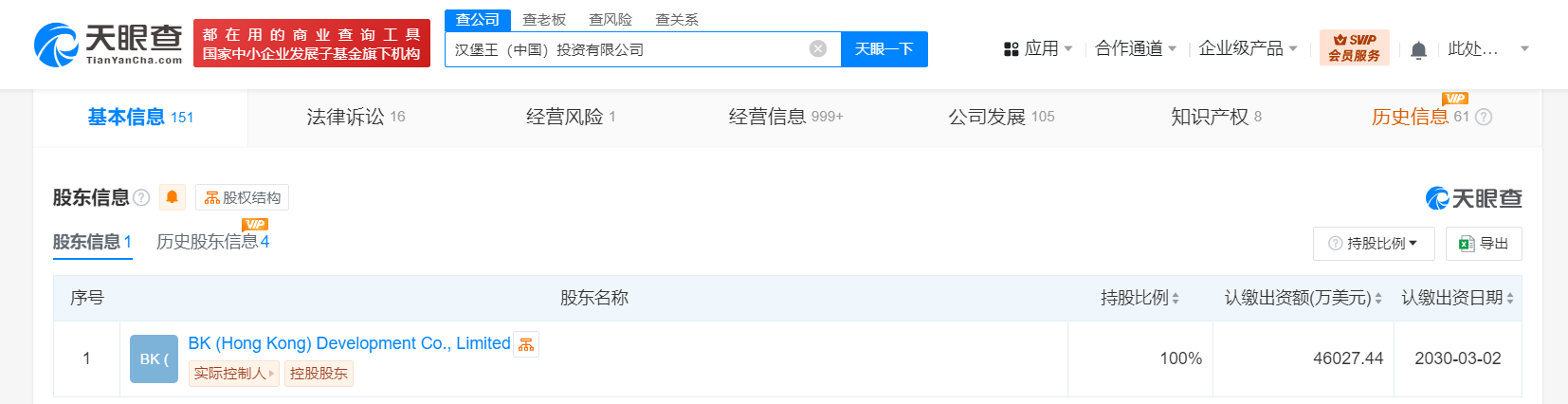 汉堡王(中国)投资有限公司近日发生工商变更,注册资本由约4.1亿美元增至4.6亿美元。此前该公司注册资本刚从约3.1亿美元增资至4.1亿美元,此次增资显示外资对中国市场的持续看好。