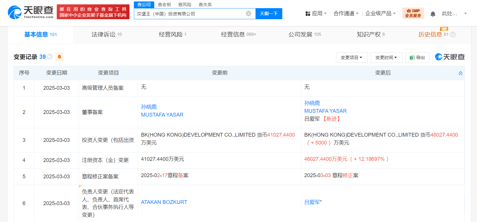 每经AI快讯,天眼查App显示,近日,汉堡王(中国)投资有限公司发生工商变更,Atakan Bozkurt卸任法定代表人、董事长兼总经理职务,由吕爱军接任法定代表人、董事长并兼任经理;同时,公司注册资本由约4.1亿美元增至4.6亿美元。值得注意的是,不久前,该公司注册资本刚从约3.1亿美元增资至4.1亿美元,此次再次增资显示出公司的强劲发展势头。
