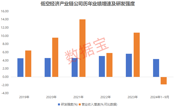 低空经济代表企业具有高知识密度、高研发协同等特点。A股市场布局低空经济的上市公司主要集中在国防军工等行业,研发投入保持高速增长。虽然短期业绩增速放缓,但长期看,低空经济产业已进入快速发展期,相关公司业绩有望大幅增长。