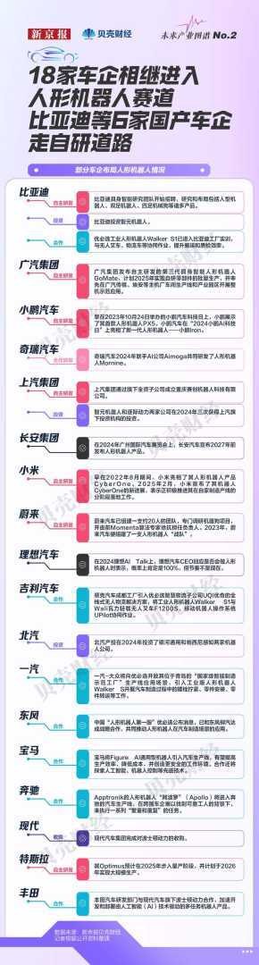 2月以来,人形机器人成为科技圈的“新贵”,产业进入加速爆发期,国内外车企纷纷通过自主研发、战略投资与产业合作进行全面布局。据新京报贝壳财经记者不完全统计,目前已有18家国内外车企涉足人形机器人领域,其中比亚迪、广汽、小鹏、上汽、小米、蔚来6家国产车企选择自研道路。比亚迪研究和布局涵盖人形机器人、双足机器人;小鹏展示了首款人形机器人PX5;蔚来推出新一代工业机器人;上汽、北汽等则通过投资强化布局,加速人形机器人商业化进程。