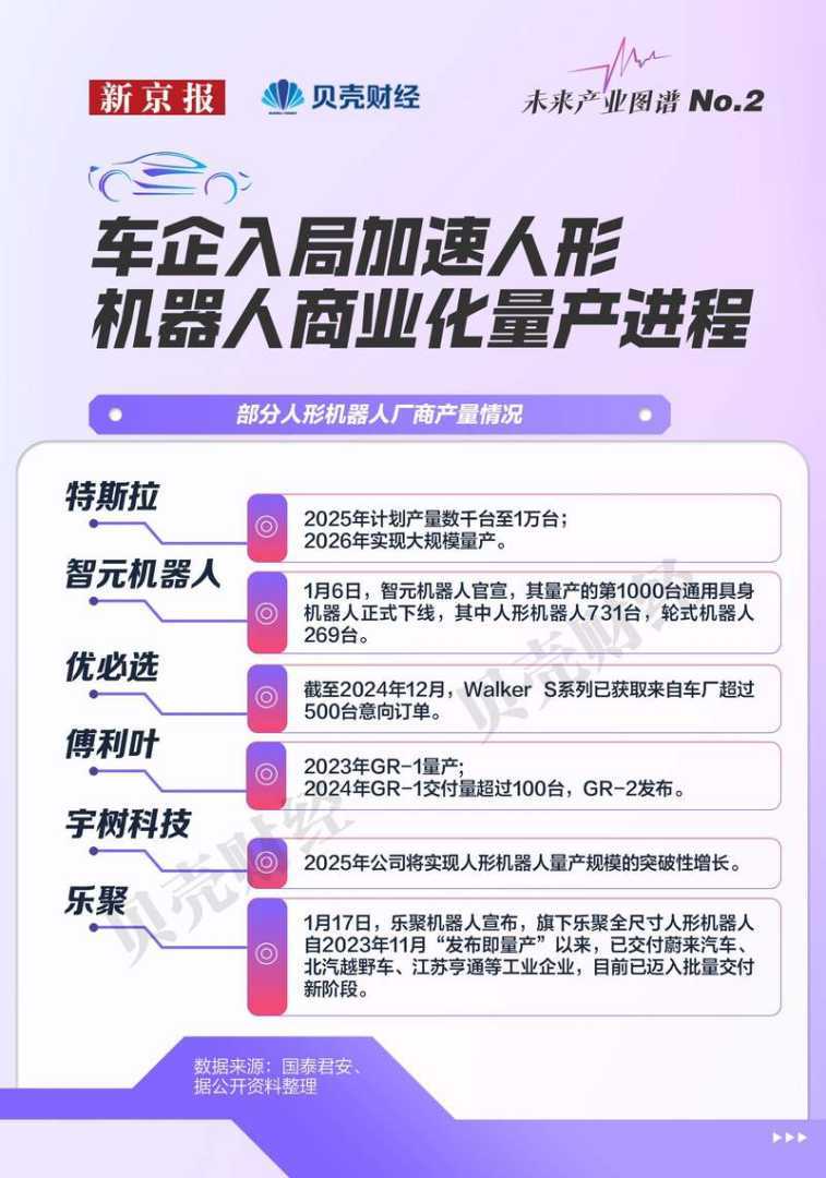 新京报贝壳财经记者梳理发现,国内人形机器人的商业化进程显著提速,应用场景主要集中在工厂装配、物流协同等领域。车企正积极推动AI控制、多任务处理等技术突破,构建“车企+机器人企业”生态圈,推动人形机器人产业向更高层次发展。