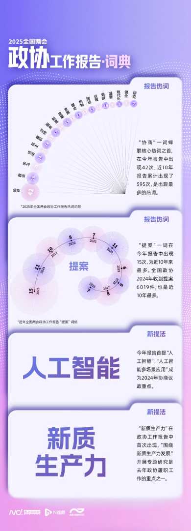 2025年全国两会,南都大数据研究院推出“全国两会词典”,对政协工作报告进行文本分析。报告回顾了过去一年工作,提出2025年主要任务。近10年报告“协商”一词累计出现近600次,今年“提案”词频创新高。报告还首提“人工智能”“新质生产力”。