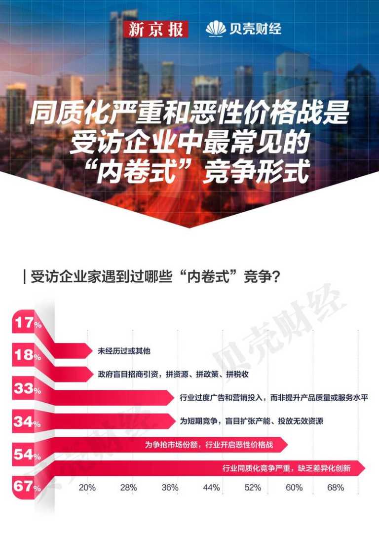 “内卷式”竞争形式多样,其中产品或服务同质化及恶性价格战尤为突出。据新京报贝壳财经调研,207位来自17个行业的企业家中,67%遇到过同质化竞争,54%遭遇过恶性价格战。