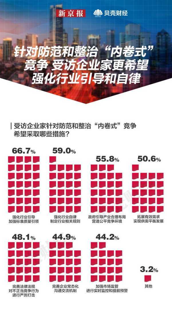 整治“内卷式”恶性竞争对提升企业创新能力、提高社会资源利用效率及推动经济高质量发展至关重要。然而,破局之道仍需多方共同努力。调研显示,66.7%的企业家期望强化行业引导,59%呼吁制定行业规则强化自律。