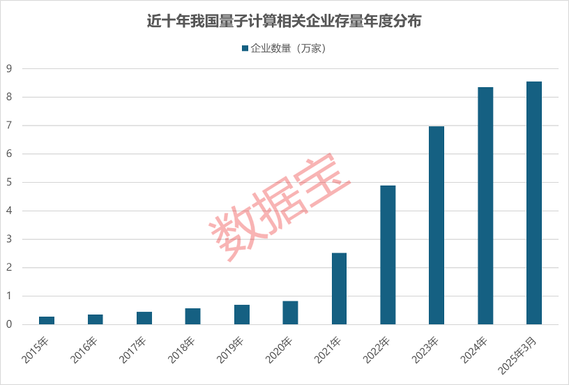 企查查数据显示,我国量子计算相关企业存量从2015年末的0.27万家逐年稳定增加,至2020年末达0.83万家;2021年开始呈现指数级跃增,分别于2021年、2023年跨越2万家、5万家门槛。截至2025年3月4日,我国现存8.56万家量子计算相关企业,较2020年增长超10倍。