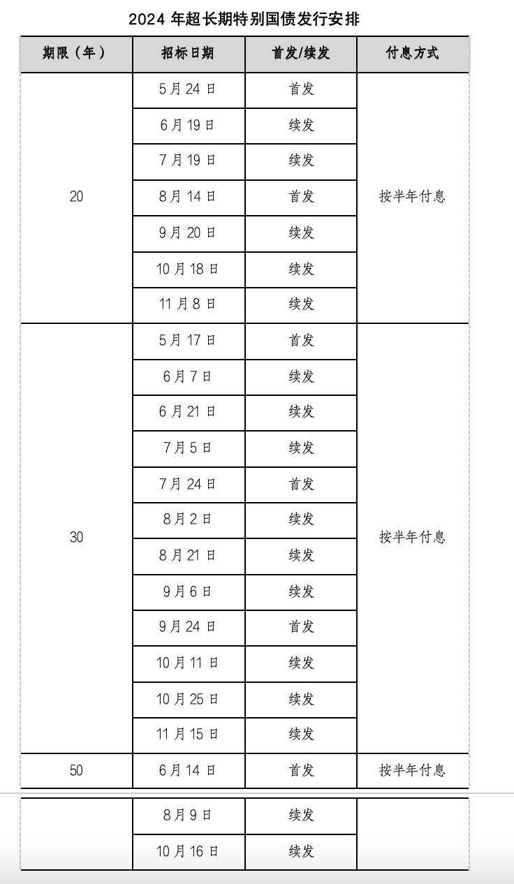 兵马未动粮草先行。5月13日,财政部国库司召开了一场国债承销团成员动员大会,释放出明确信号:我国即将启动超长期特别国债的发行工作。同日,财政部办公厅正式发布了《2024年一般国债、超长期特别国债发行有关安排》的通知,详细阐述了后续国债的发行规划。