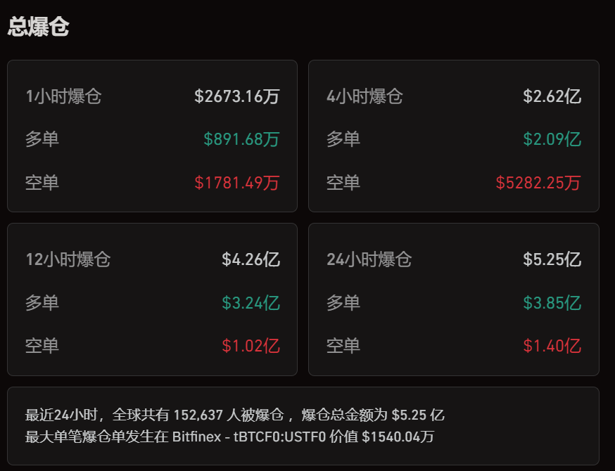 剧烈的市场波动导致众多投资者遭受重大损失。据Coinglass数据显示,近24小时内有超过15万人爆仓,涉及金额高达5.25亿美元(约合人民币38亿元)。