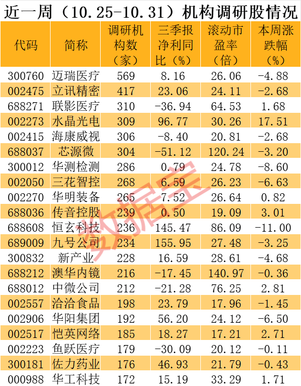 迈瑞医疗成为近一周机构关注度最高的个股,共有569家机构对其进行调研,其中包括97家基金、62家证券公司、143家私募和33家险资。迈瑞医疗2024年前三季度实现营业收入294.8亿元,同比增长8%;归母净利润106.4亿元,同比增长8.2%。此外,公司还计划继续推行一年多次分红,本次三季度报告后将向全体股东每10股派发现金红利16.5元,分红金额约20亿元。