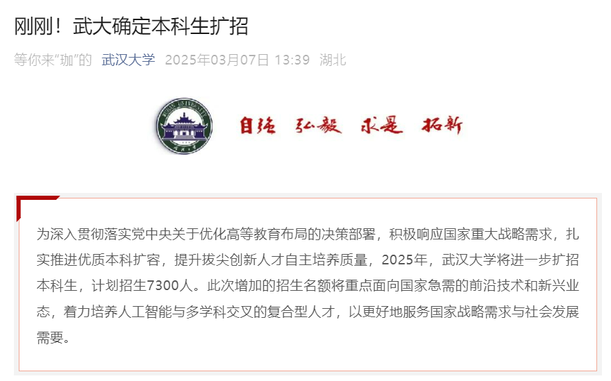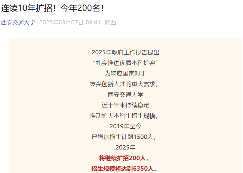 3月7日,武汉大学与西安交通大学率先发文,宣布扩大本科生招生规模。其中,武汉大学计划招生7300人,而西安交通大学扩招200人,招生规模将达到6350人。这一举措不仅为学生提供了更多接受优质高等教育的机会,也体现了高校对国家人才战略的支持。